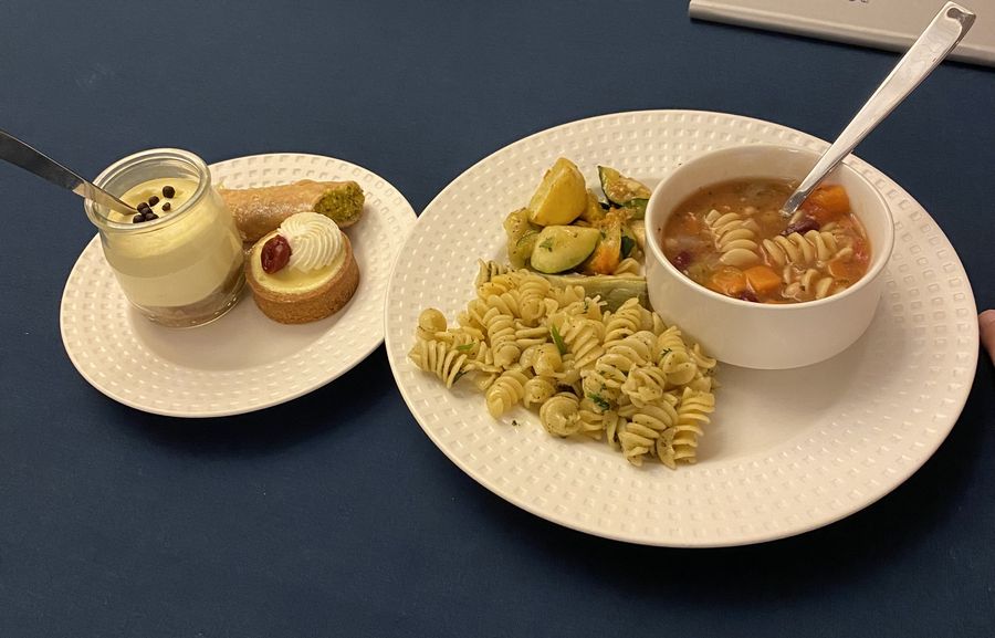 昼は仔牛肉、焼いたジャガイモ、ミニトマト、インゲン、マッシュルームだった