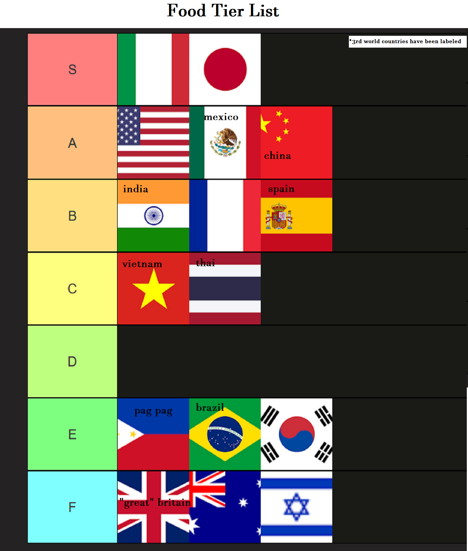スレッド「世界の最もメシが美味しい国Tierリスト」より。
