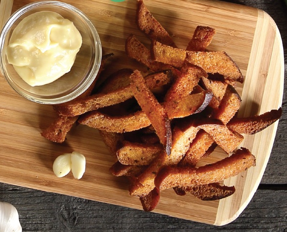 ライ麦パンのガーリックトーストにチーズソースをつける