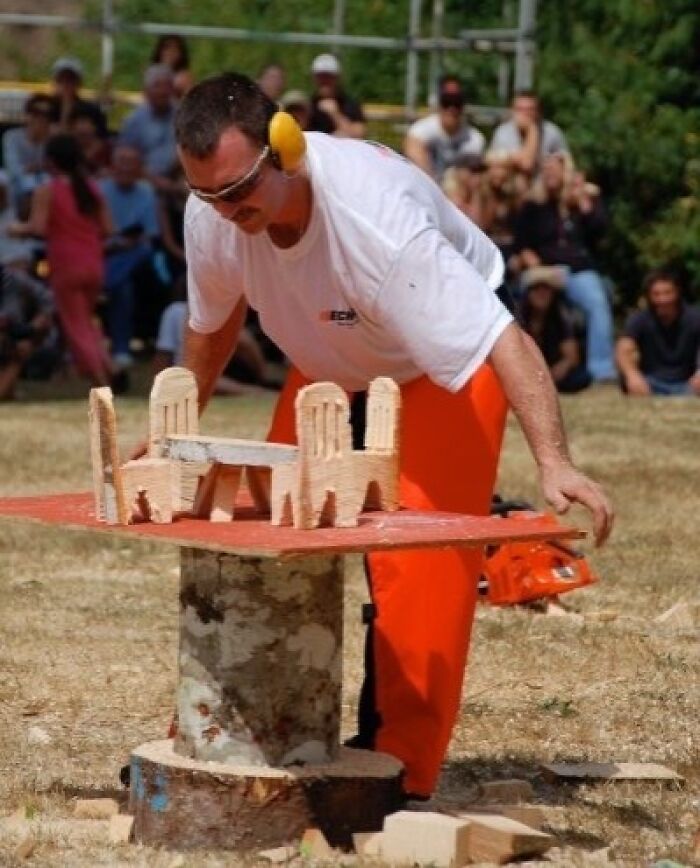 5分で切り株から椅子を作るって大会なんだが1人の男が4個の椅子とテーブルを作ってた