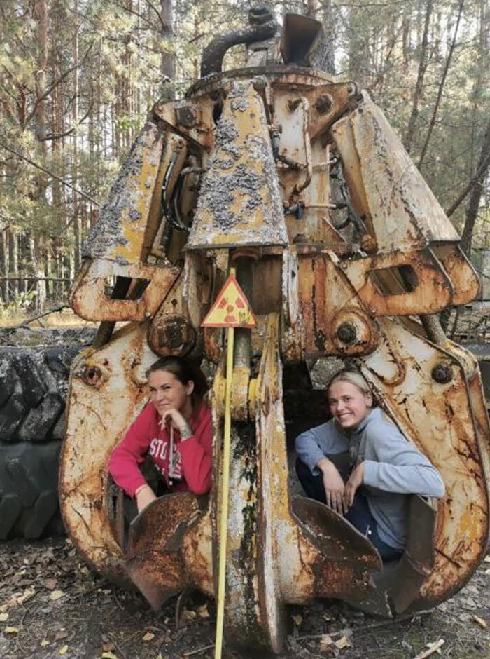 チェルノブイリ原発事故で使われた掘削機のアームに座る観光客(致死レベルの放射線量)