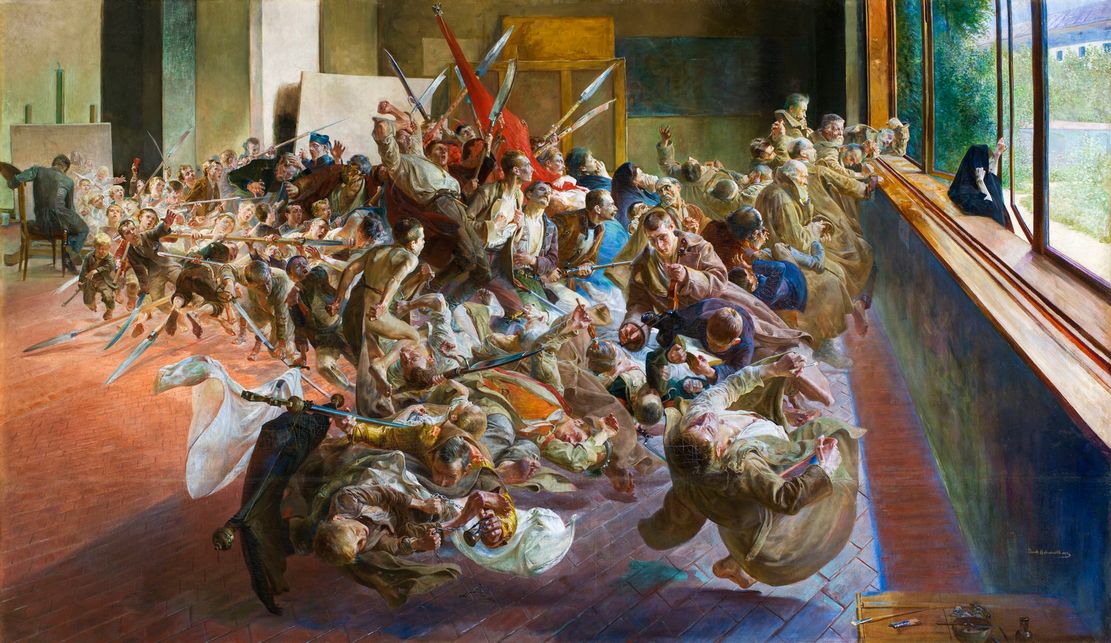 澄みきった青空と雲が戦争画とは思えないほど綺麗で
