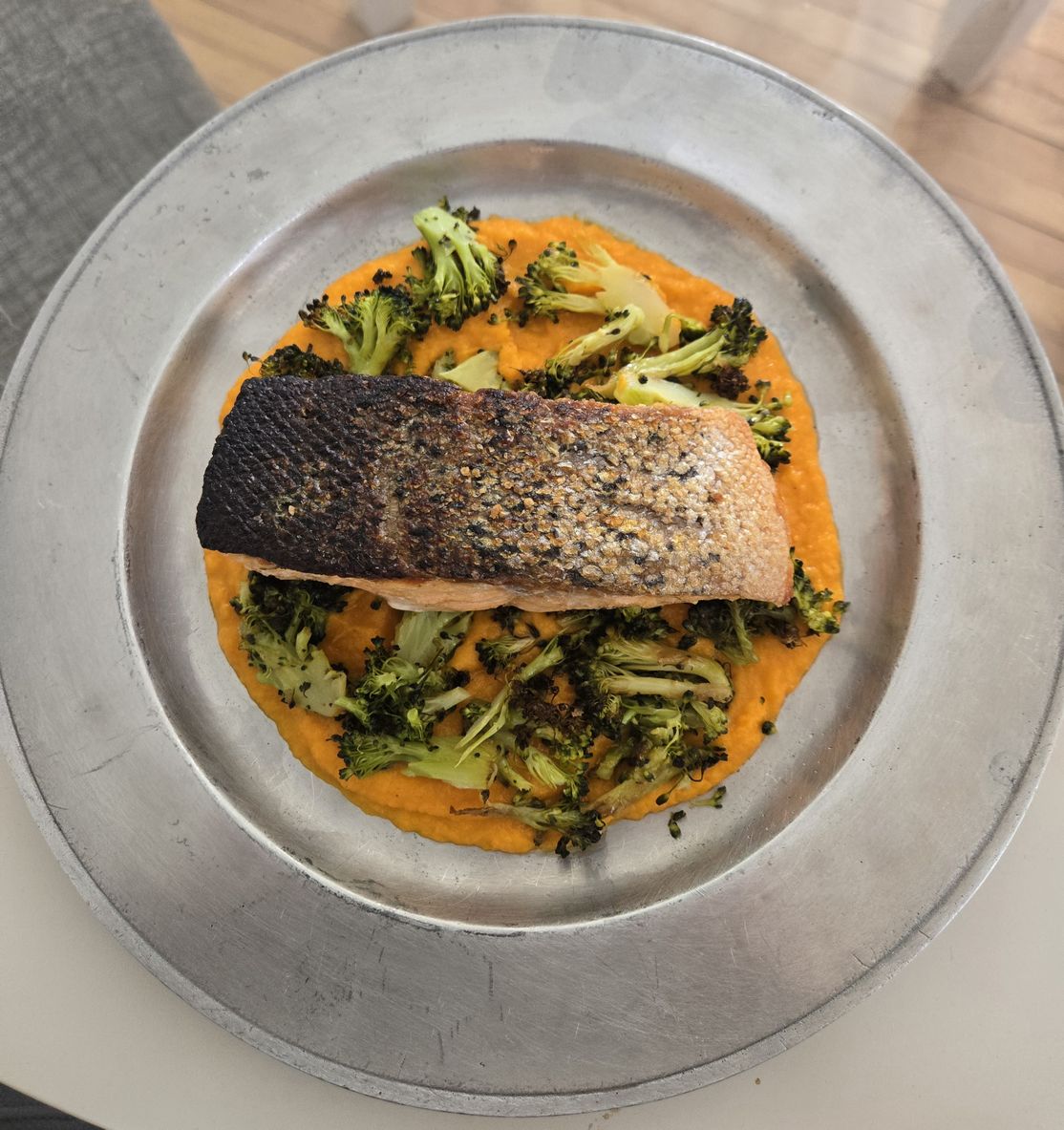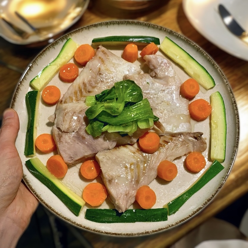 自分は大きなイカの足を茹でて焼き、生のフェンネル(ハーブ)と自家製バジルソースを加えてみた