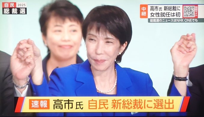 高市早苗氏が自民党総裁選の決選投票に勝利し、日本初の女性首相が生まれた歴史的瞬間だ!