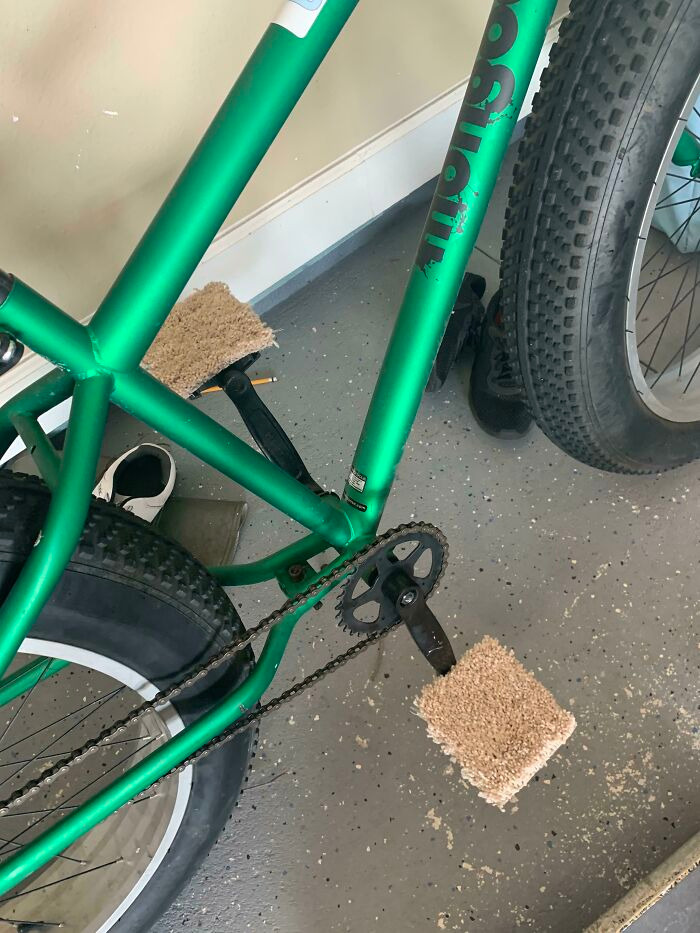 12歳の息子が裸足で自転車に乗れるようにカーペットで改造してた