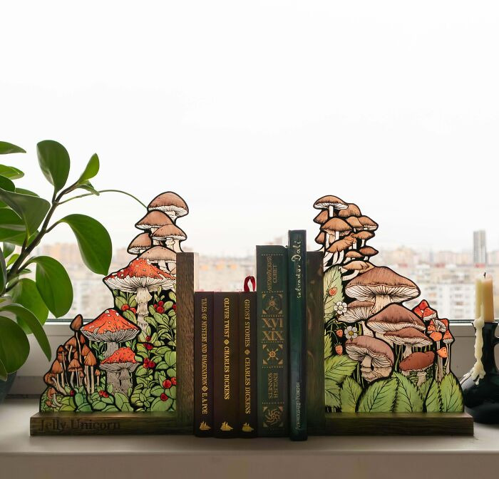 ハンドメイドのステンドグラスのキノコブックエンド