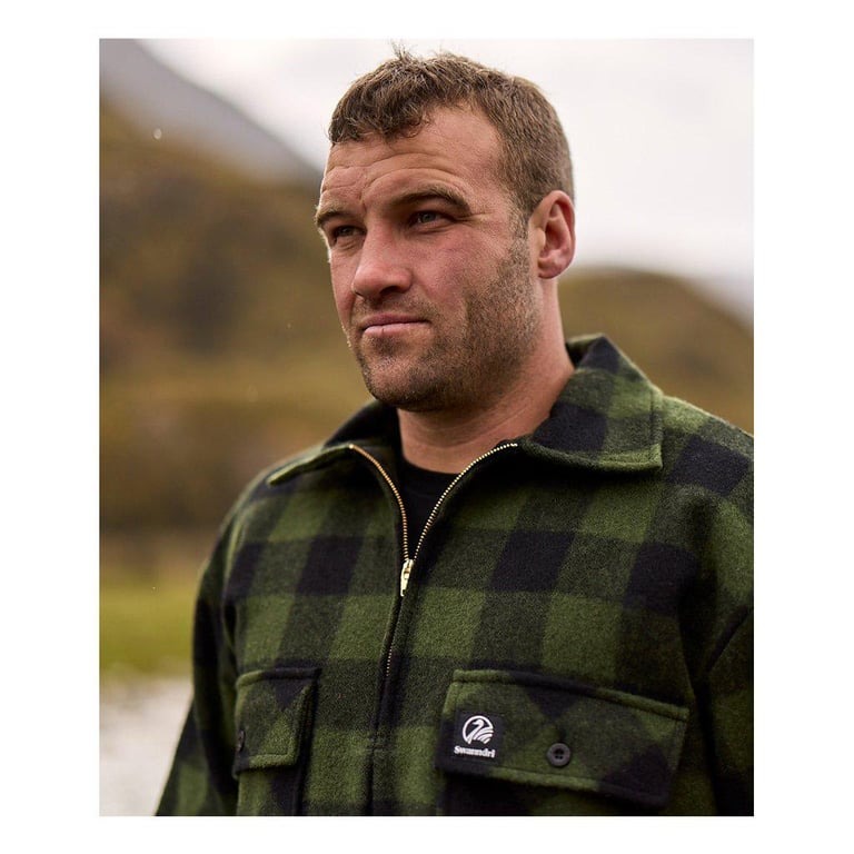 ハンチング帽、古いウールのジャンパー、シャツ