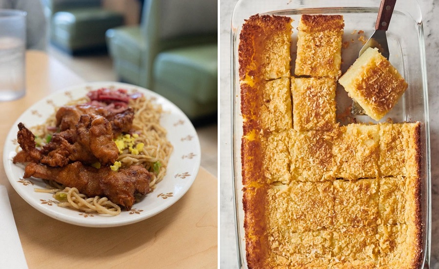 ポテト餅チーズ、ハワイ流のもち粉チキン、もち粉を衣にした海老フライ