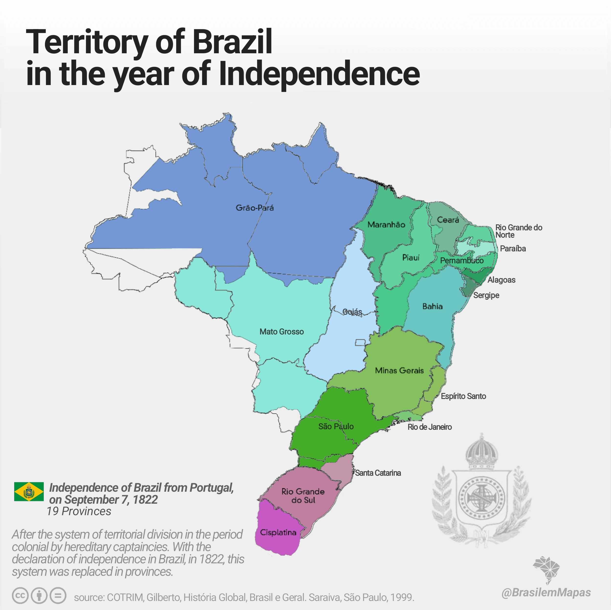 主に先住民の土地(青と白)、ウルグアイ(州の1つになる予定だったがブラジル人が支配)
