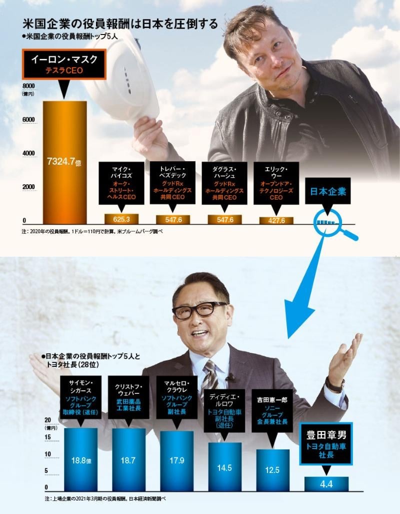 欧米はトップが数十億円の給料(役員報酬)をもらうのが当たり前なので、実は日本は世界で格差の小さい国だったりする(ちな、テスラのイーロンマスクは年収153兆円w)