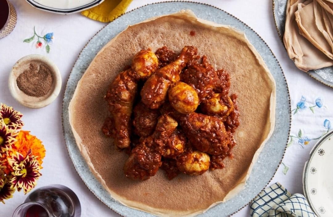(鶏肉の煮込みとインジェラという発酵テフ粉で作ったクレープ)