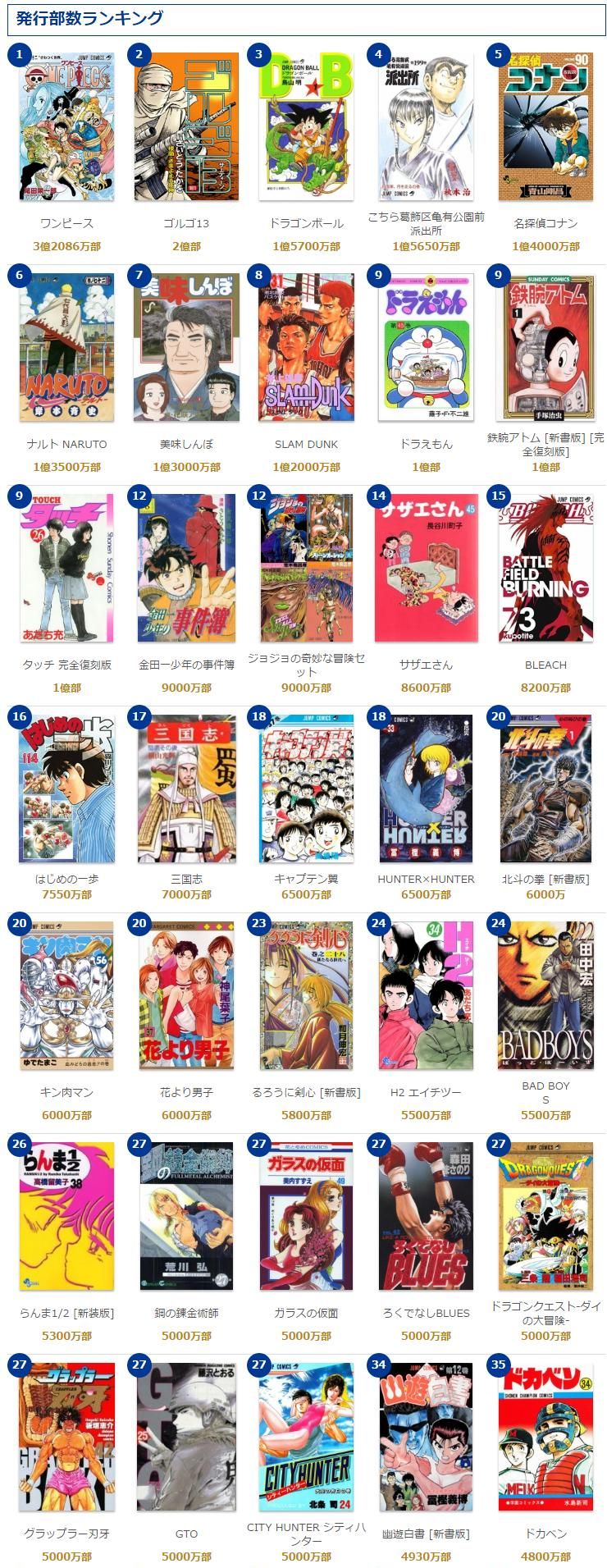 スレッド「日本のセールスランキング」より。Reddit漫画板で日本のコミックス累計発行部数ランキングが話題を集めていたので反応をまとめました。画像が長くて省略しましたが36位以下は漫画全巻ドットコムさんのランキングを参照ください。