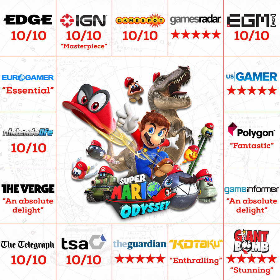 本日発売のニンテンドースイッチ向けソフト『スーパーマリオオデッセイ』の国内外の評価が完璧に近い数字を集め話題を集めています。ファミ通の39点をはじめ、IGNやEdgeなど数々のレビューサイトで満点。また点数は変動するものの、メタスコアでは97点スタートと歴代でも10数本しか出せていない高い数字となっています。