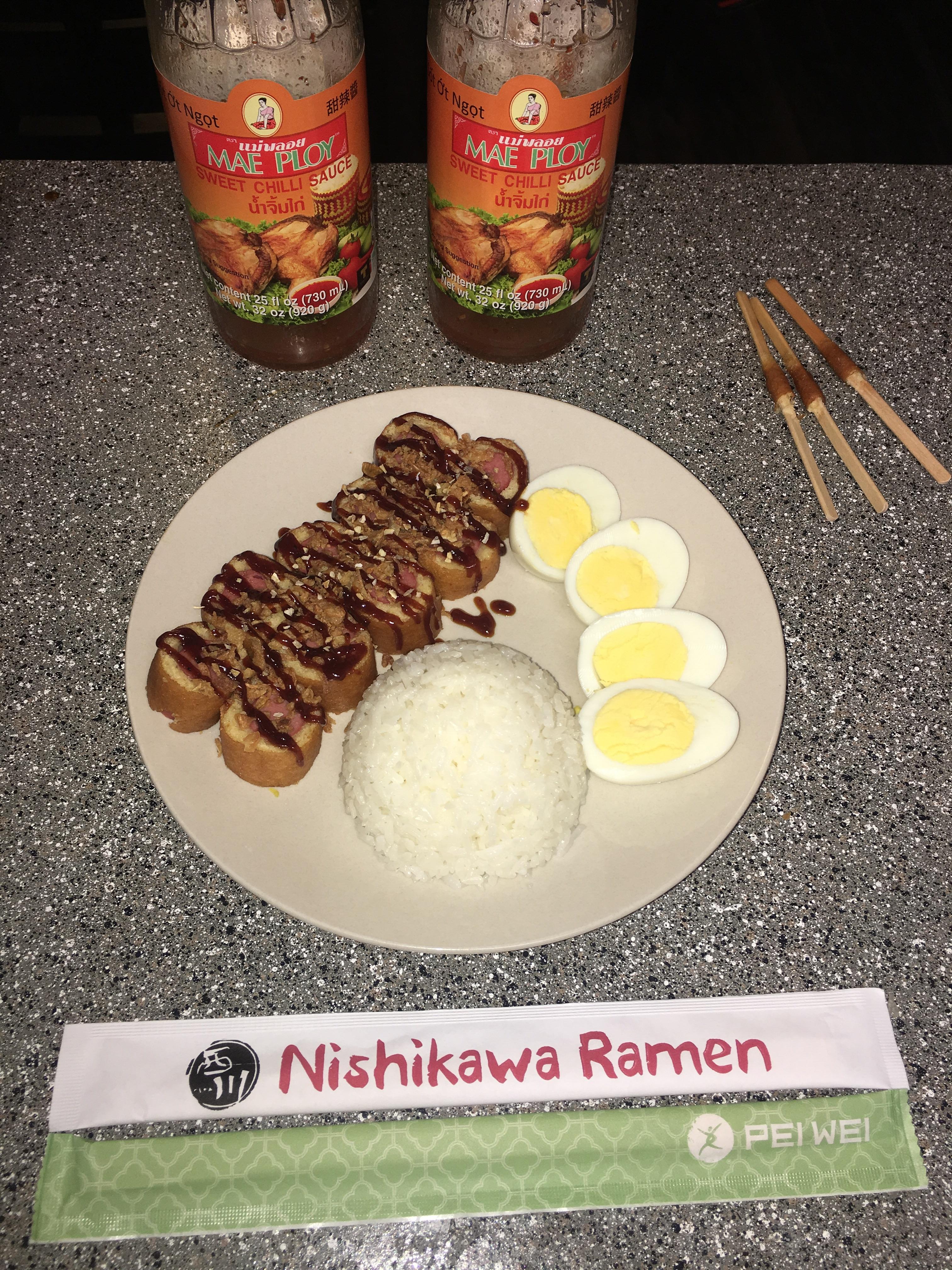 チリソースをかけて、ゆで卵と1カップのご飯を添えるという良い食事をしている