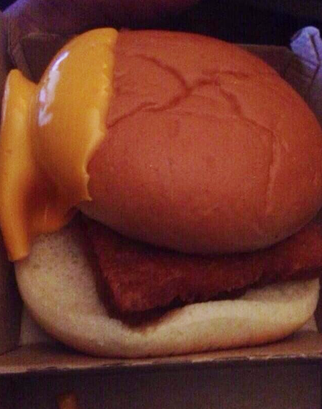 スレッド:「何でマクドナルドってどこへ行っても見本通りの商品じゃないの?」より。チーズが大きくはみ出した・・・というより適当に入れただけのハンバーガーにスレ主は文句をつけている。