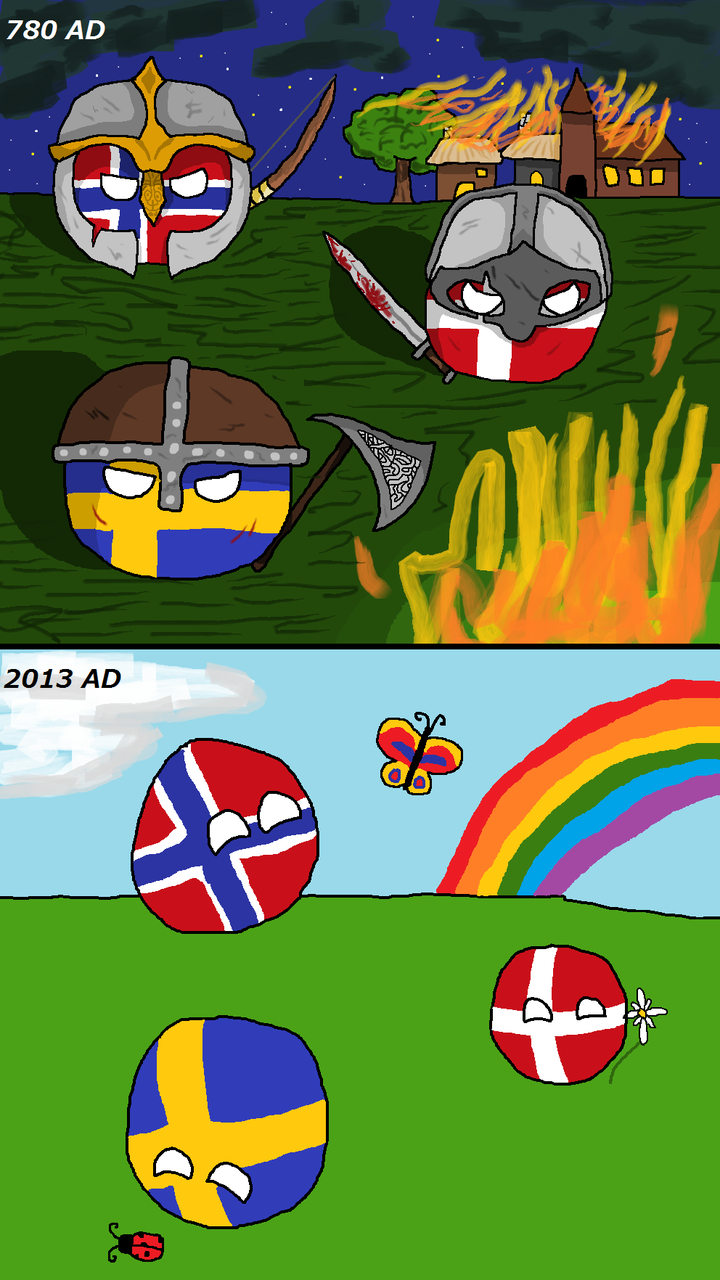 ヴァイキング全盛の頃は荒くれ者の巣窟であった北欧3カ国(デンマーク、ノルウェー、スウェーデン)が、今では理想主義の夢を見続けているというギャップを描いたイラストが話題となっている。